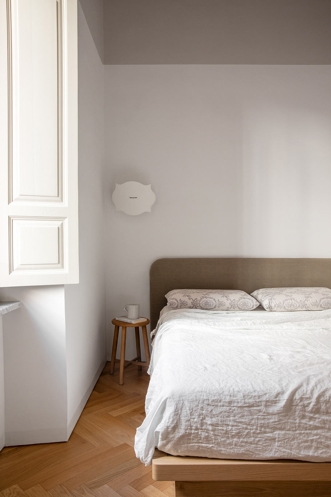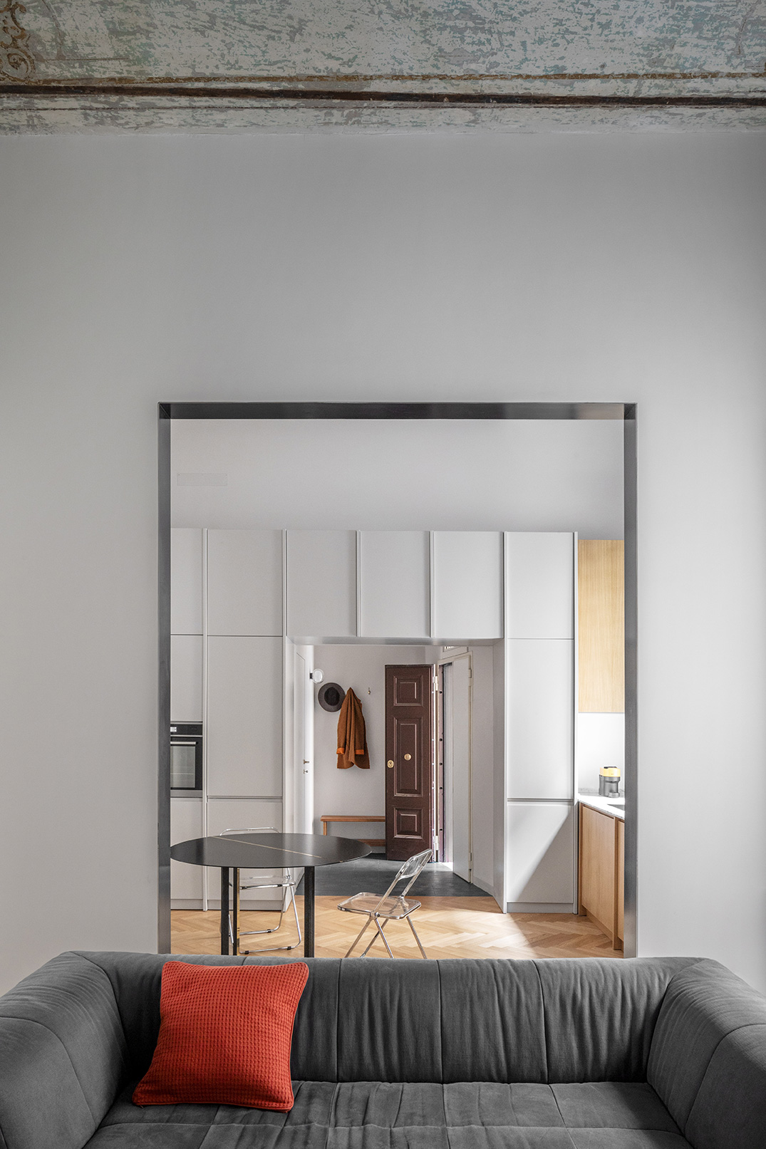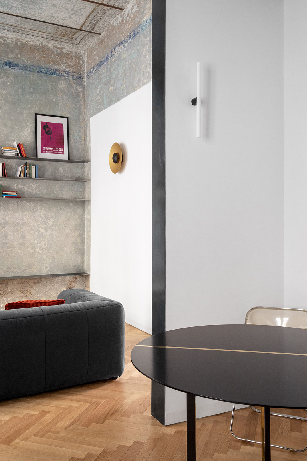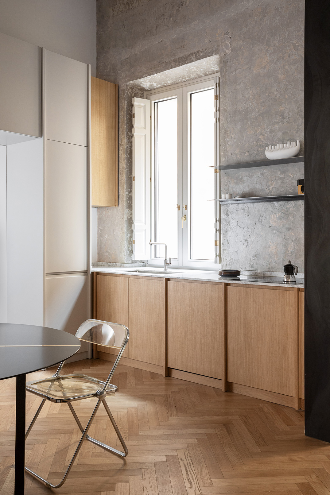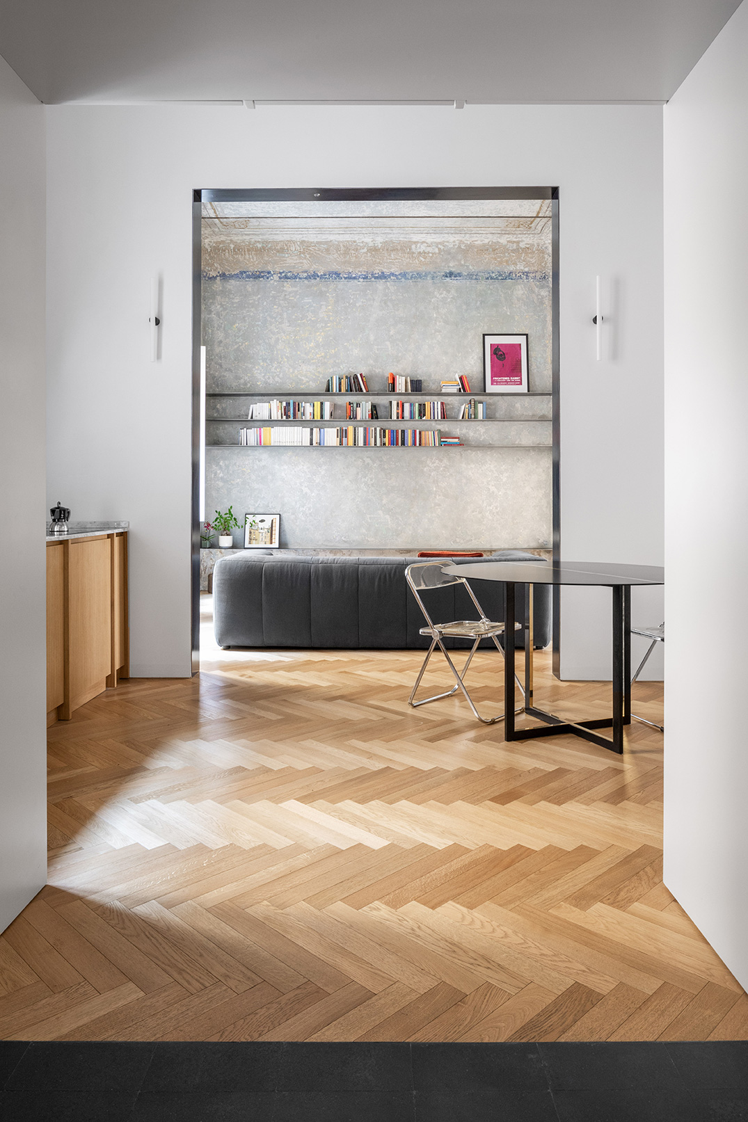 Le ampie finestre, affacciate su un cortile interno, sono state il fulcro dell’intervento progettuale, guidando l’apertura degli spazi e favorendo una circolarità dinamica. La luce naturale attraversa gli ambienti, mettendo in risalto il connubio tra tradizione e modernità che caratterizza l’intero appartamento.