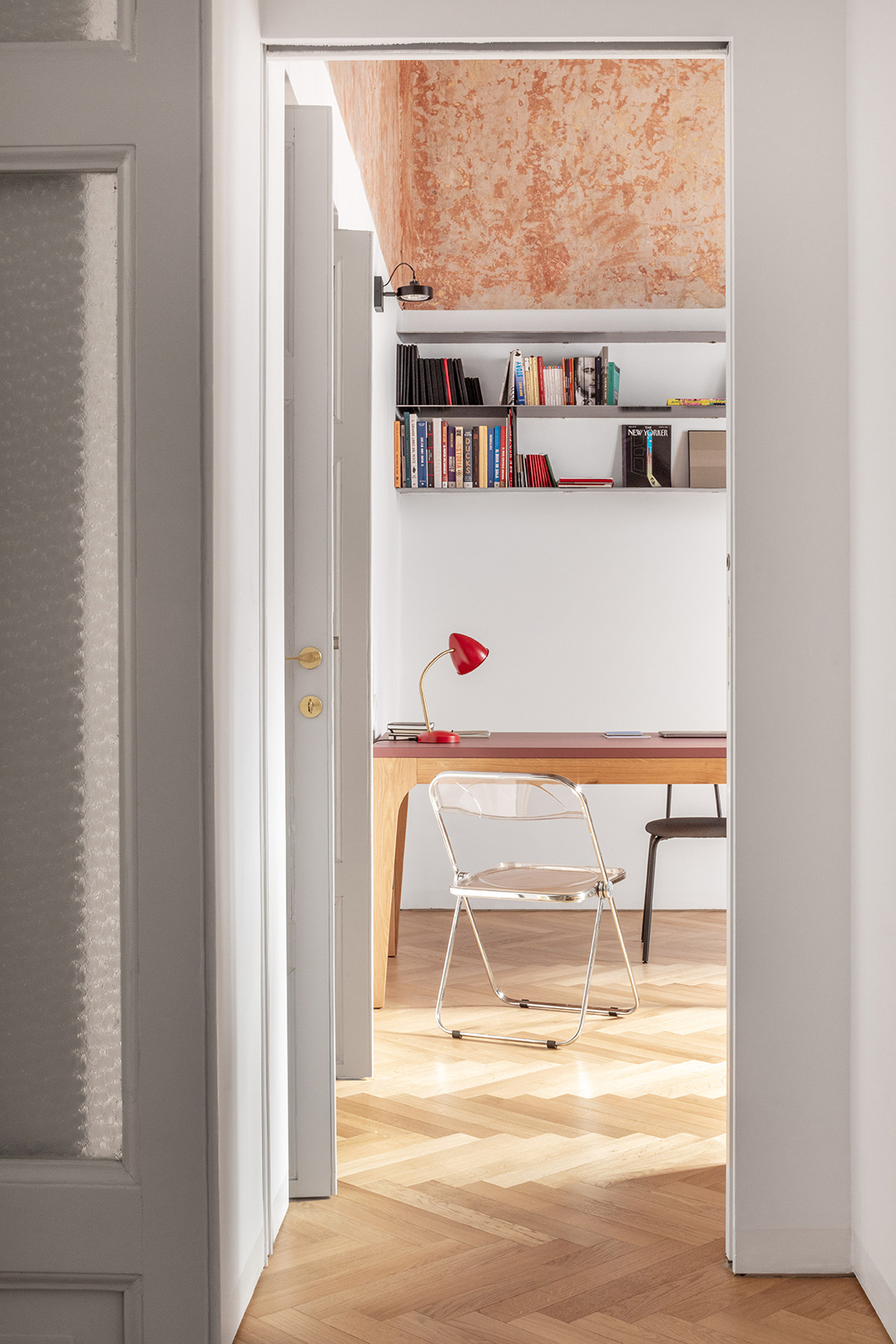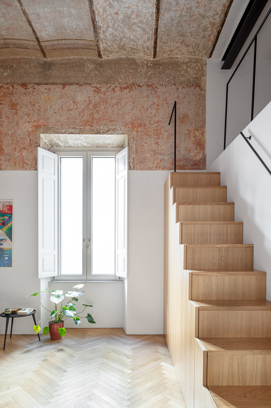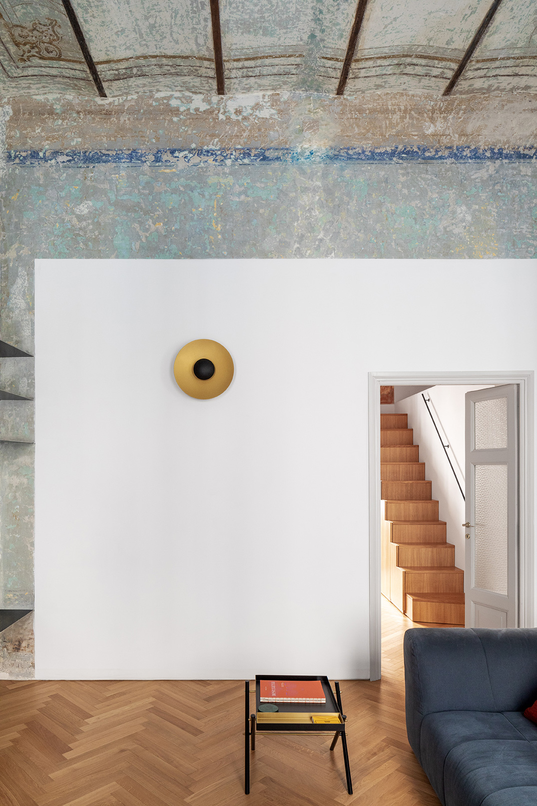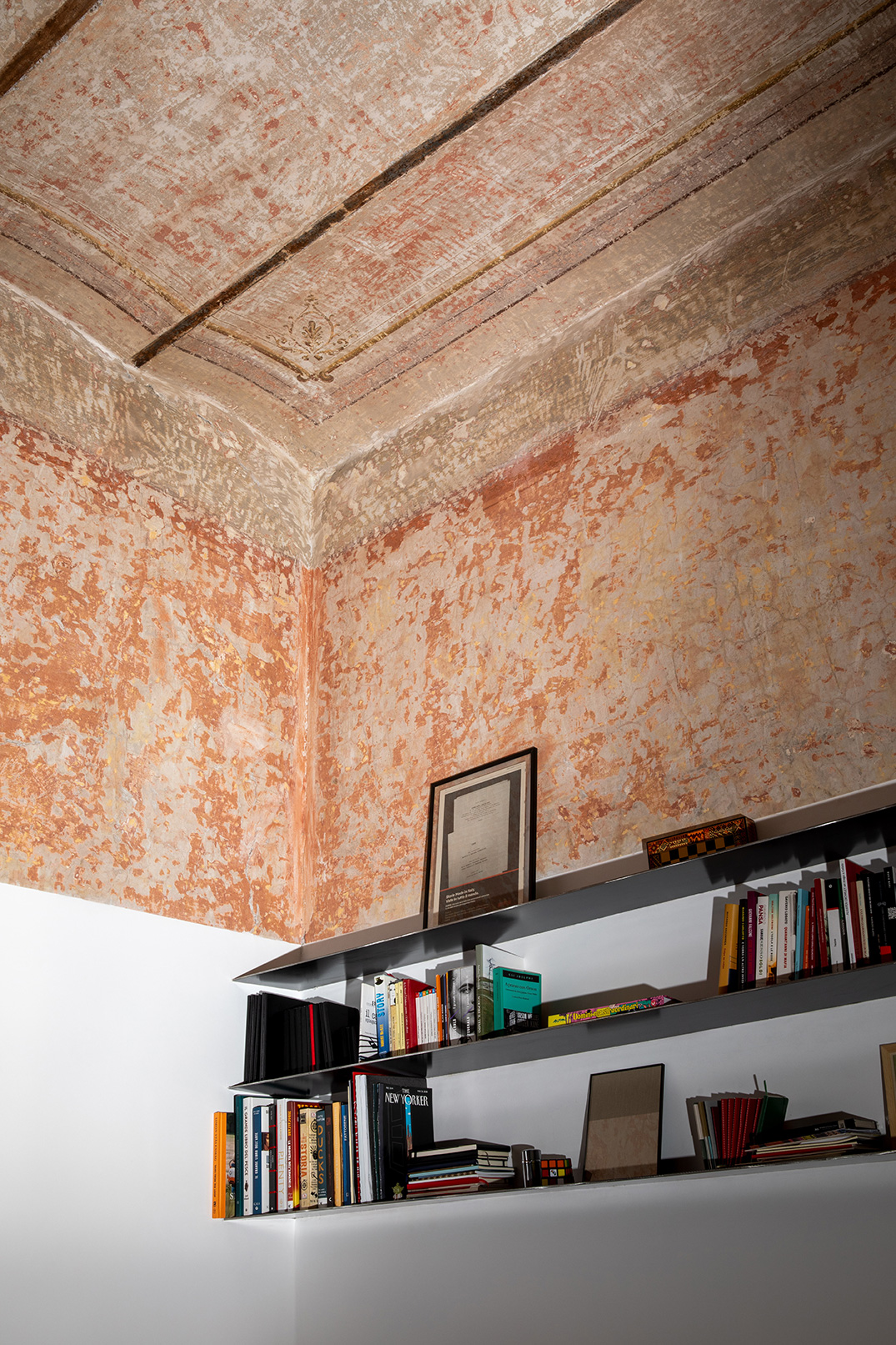 Nello studio, una scala in rovere con funzione contenitiva conduce a una zona soppalcata, un rifugio intimo per momenti di lettura e relax. Le pitture originali, meticolosamente recuperate, rievocano l’anima storica della residenza, stabilendo un dialogo poetico con gli interventi contemporanei.