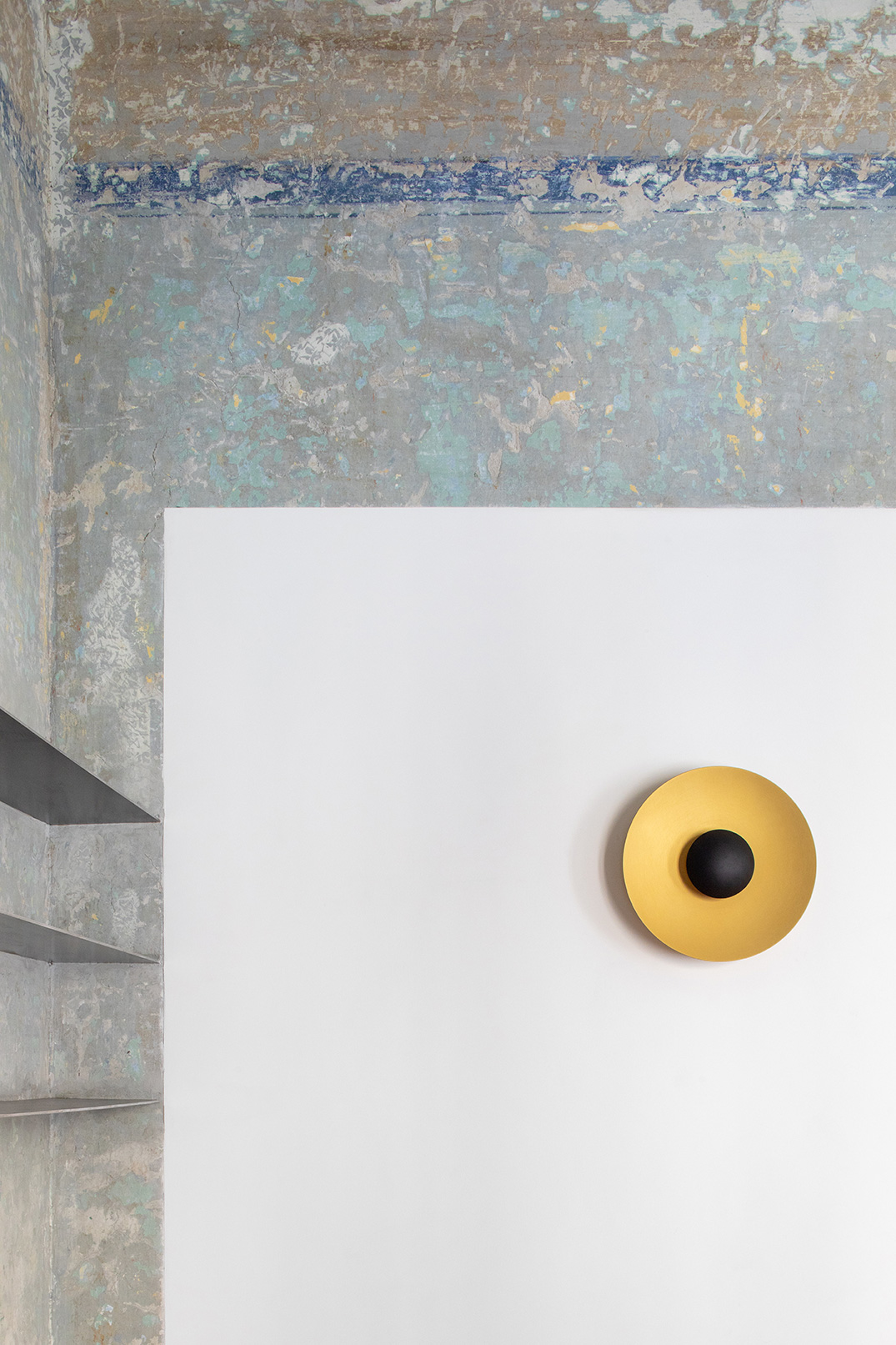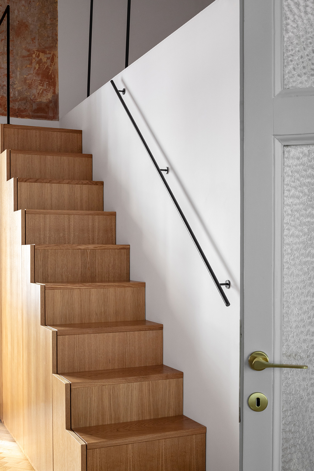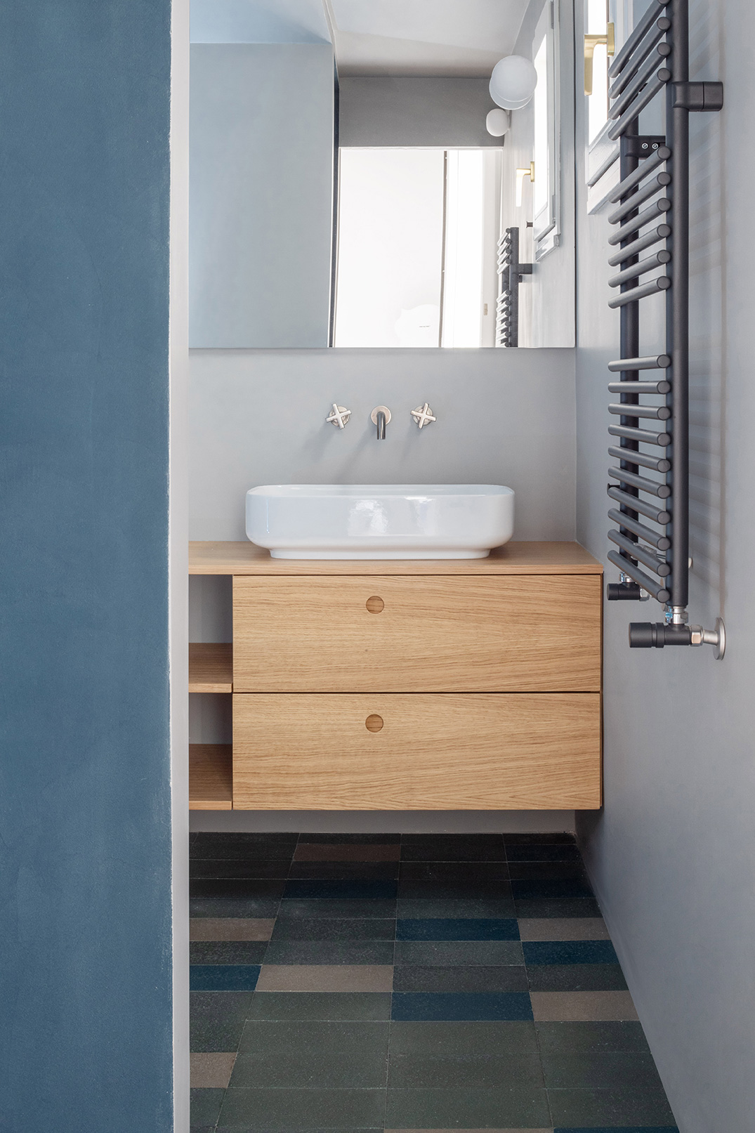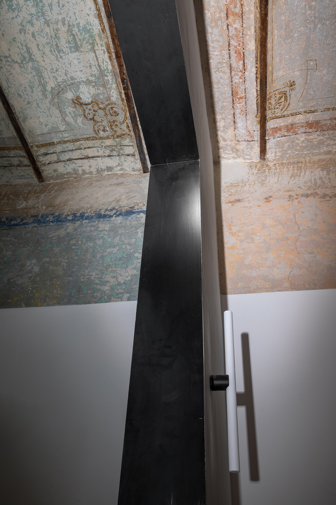 Nello studio, una scala in rovere con funzione contenitiva conduce a una zona soppalcata, un rifugio intimo per momenti di lettura e relax. Le pitture originali, meticolosamente recuperate, rievocano l’anima storica della residenza, stabilendo un dialogo poetico con gli interventi contemporanei.