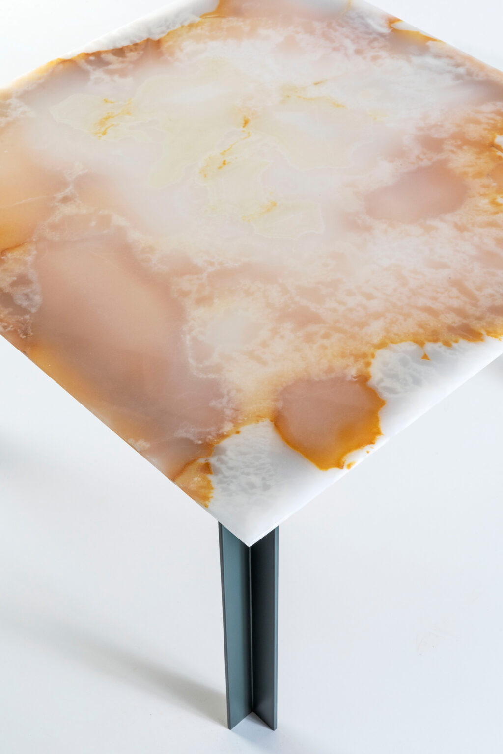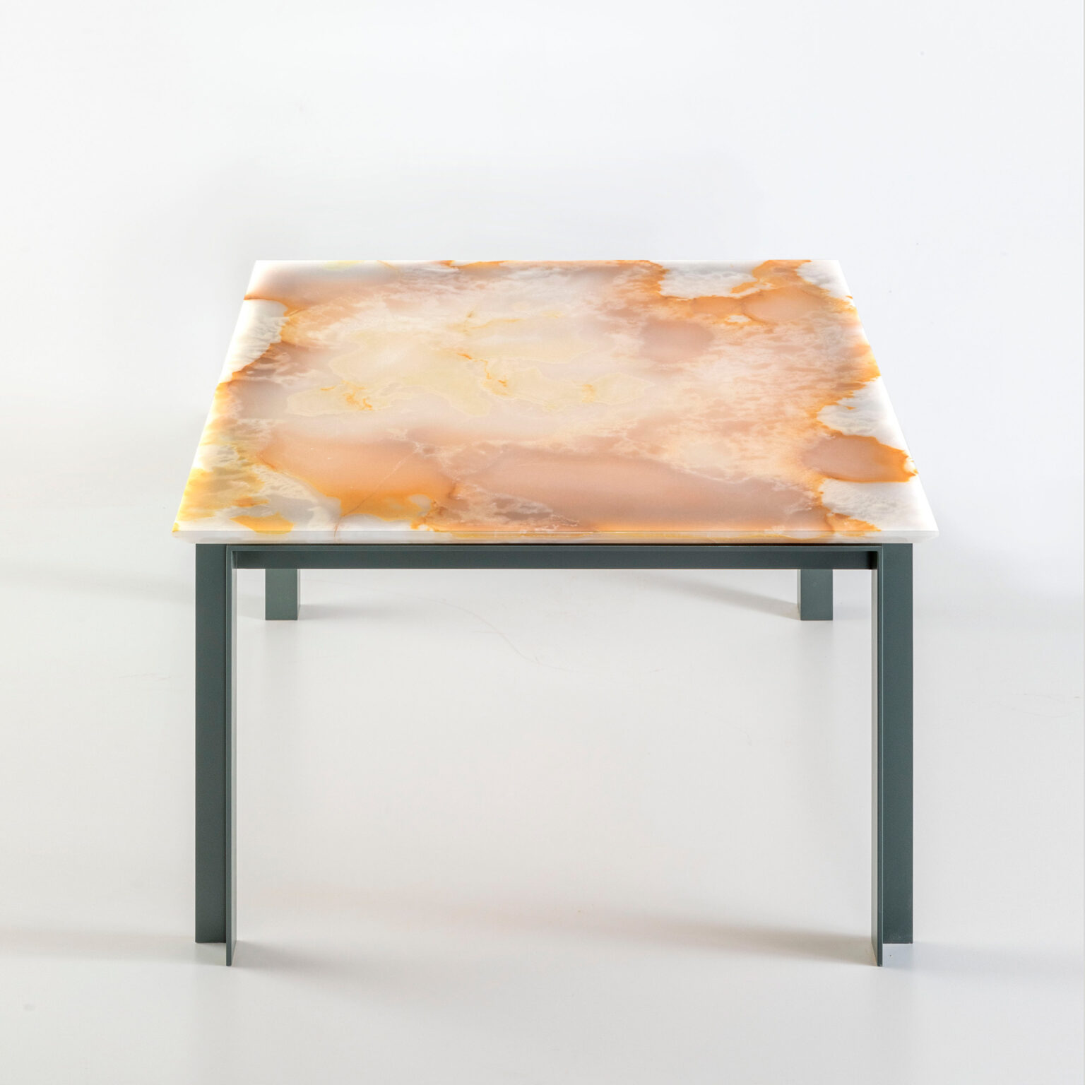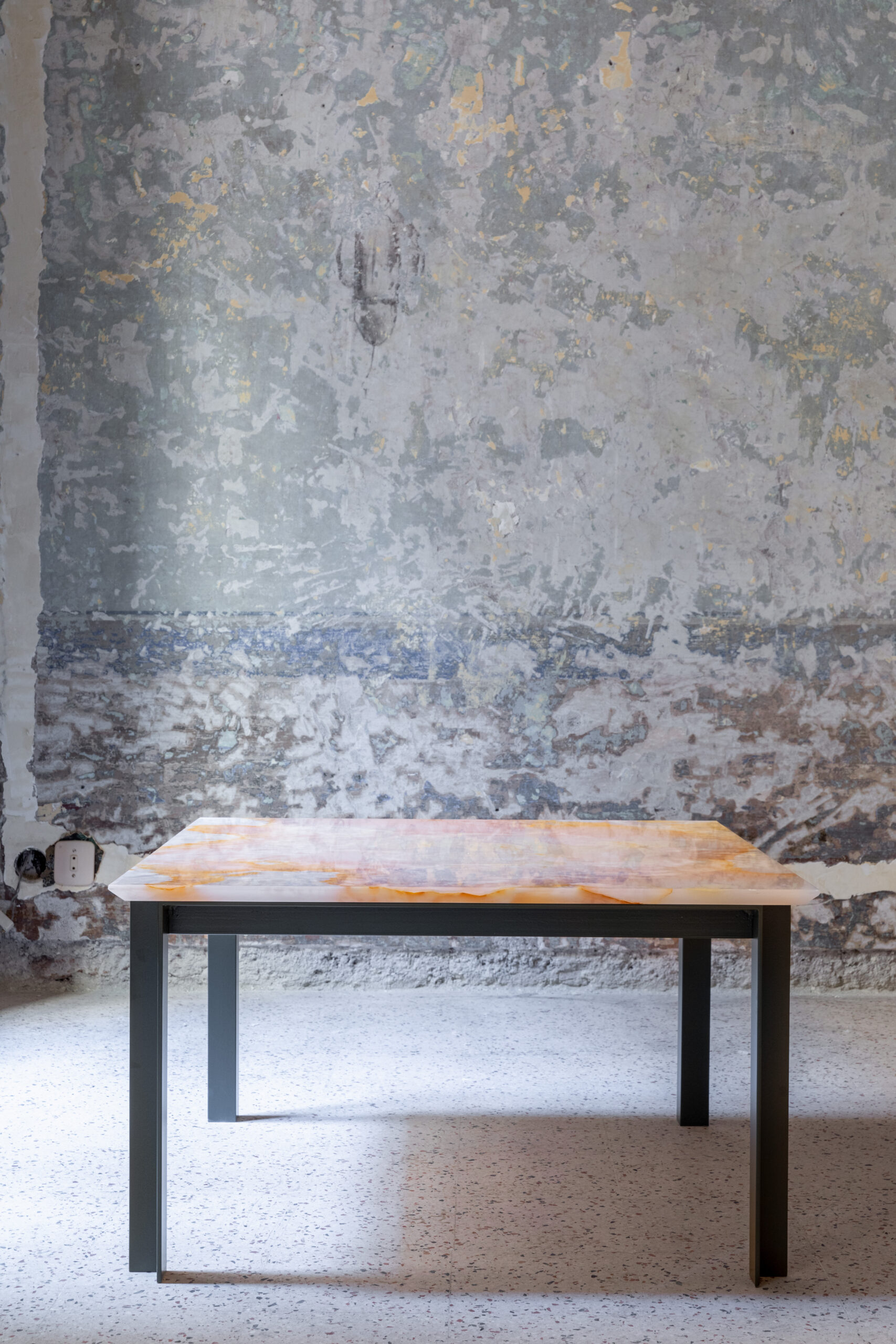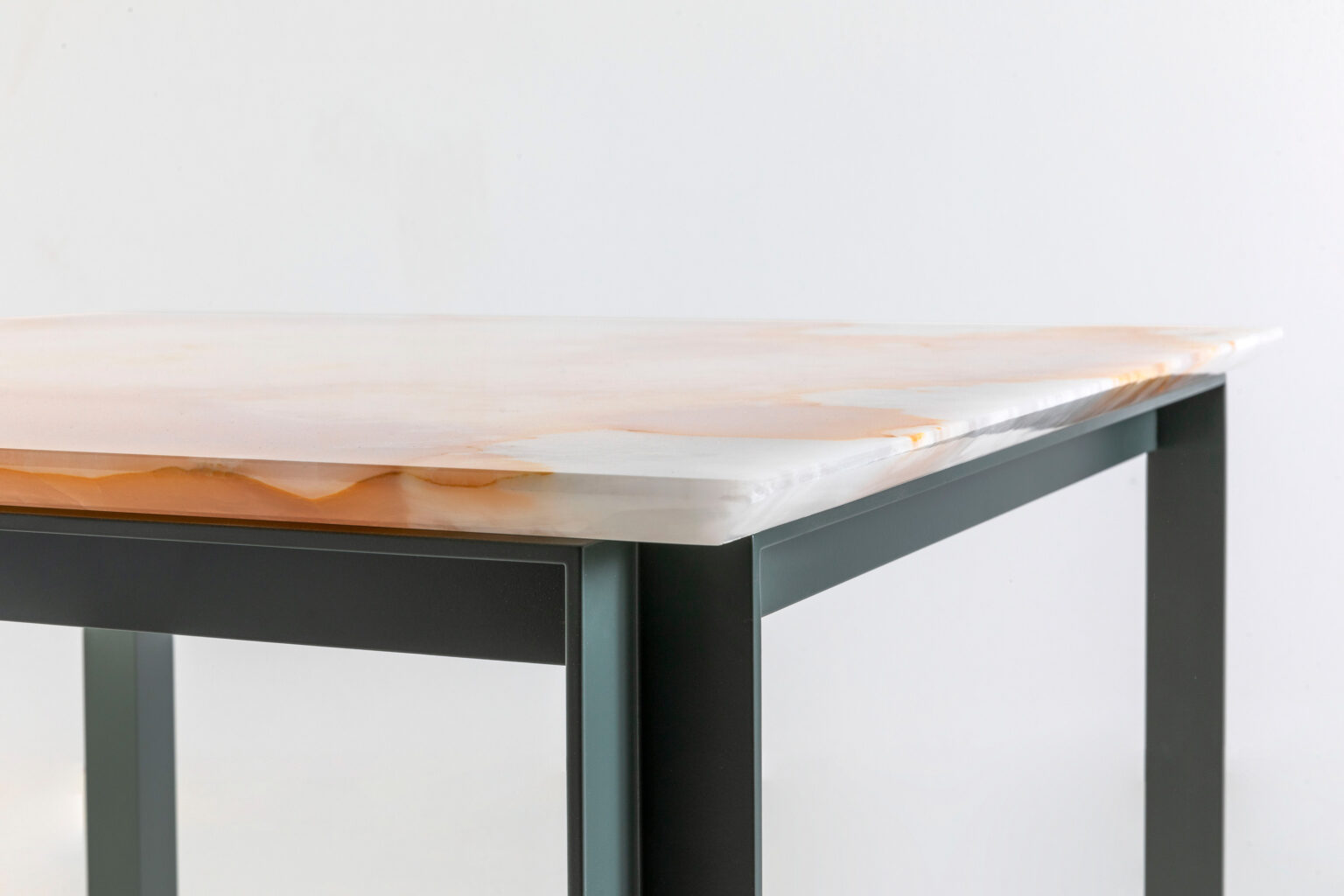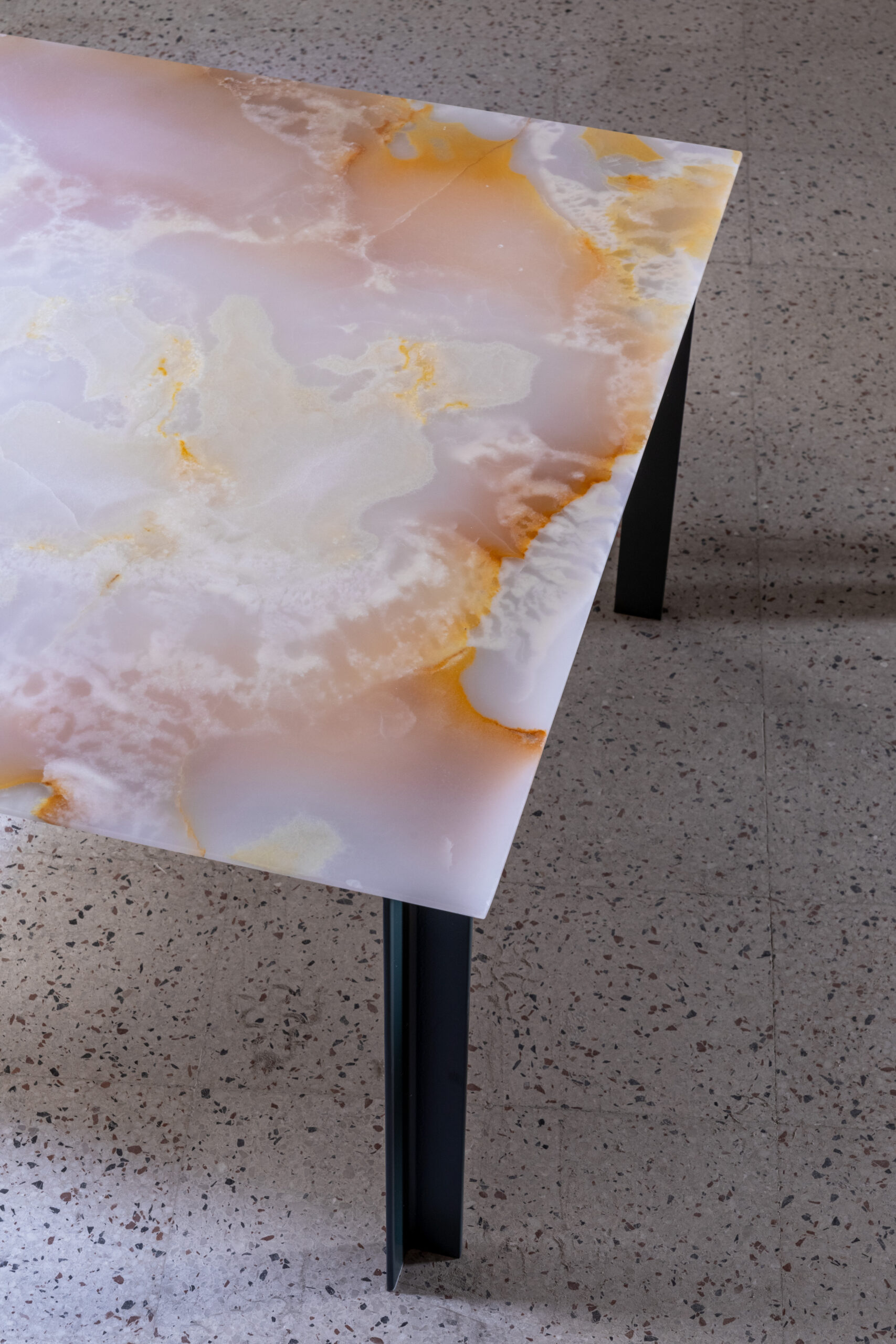 Tavolo composto da piano in onice e struttura realizzata con profili a L in ferro verniciati, finitura opaca.