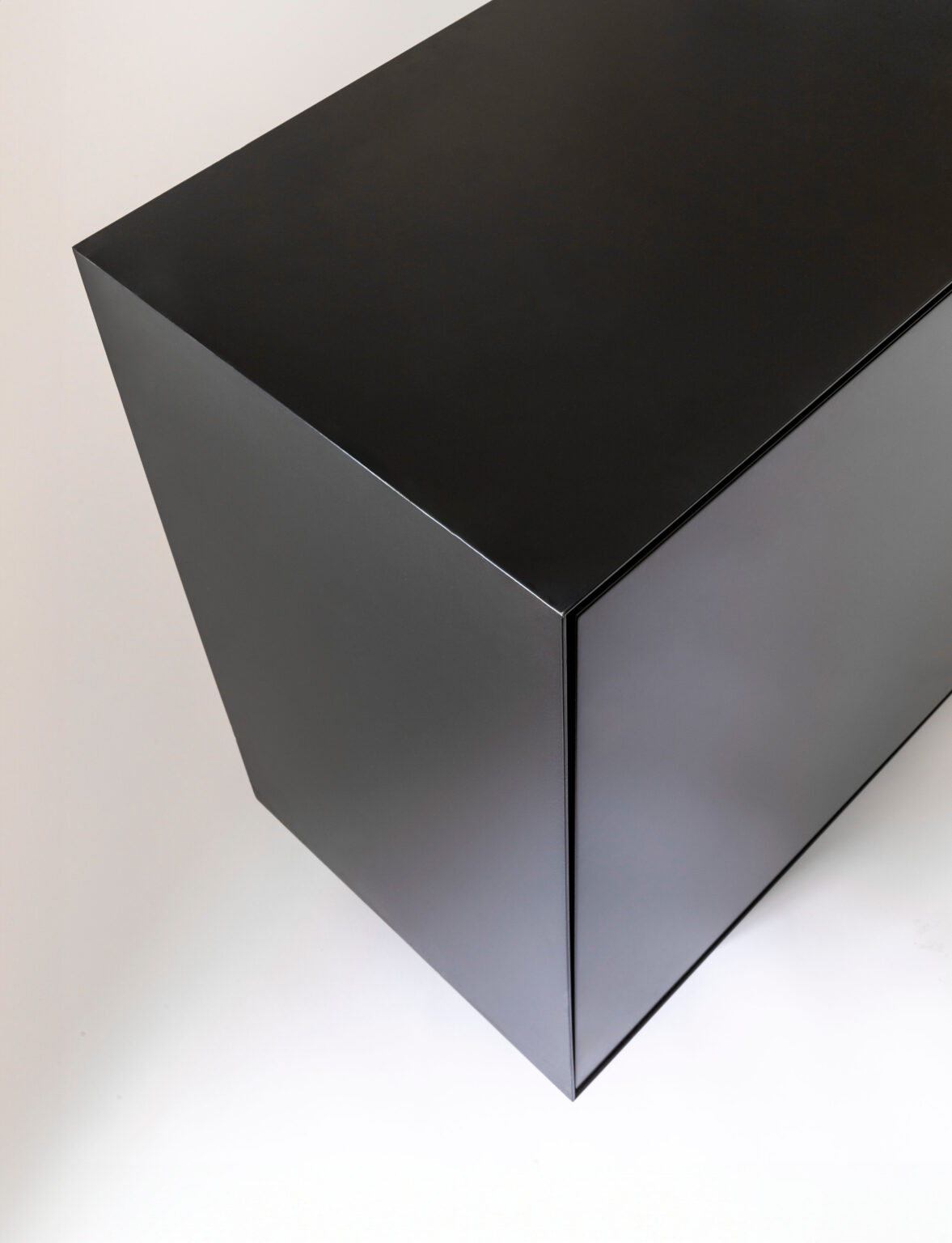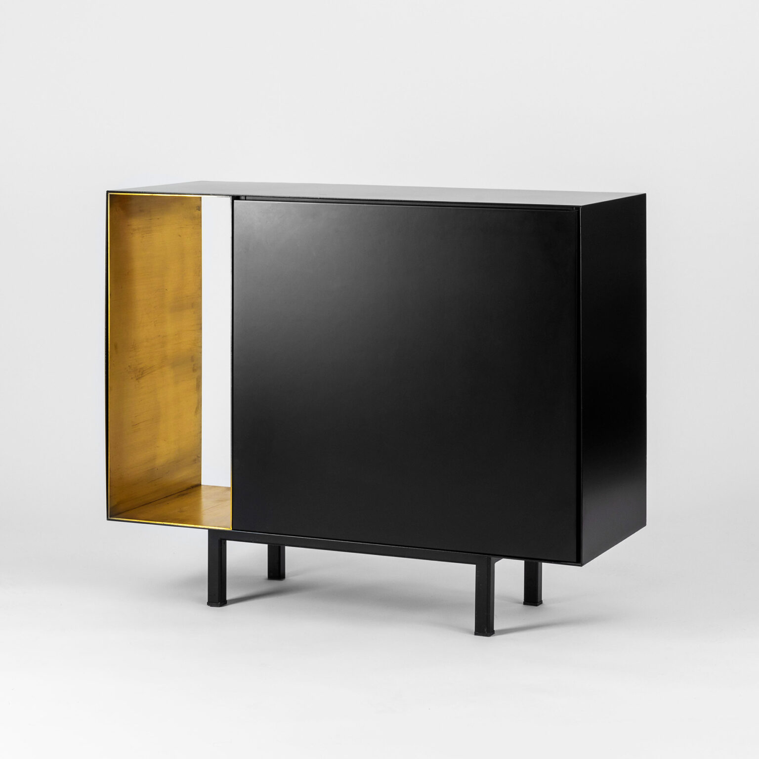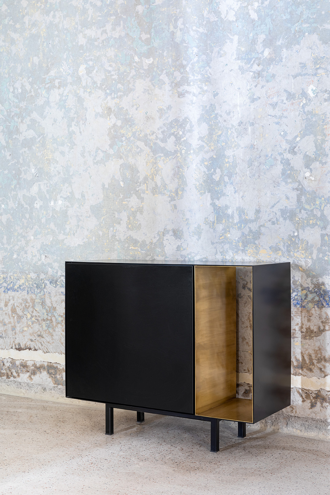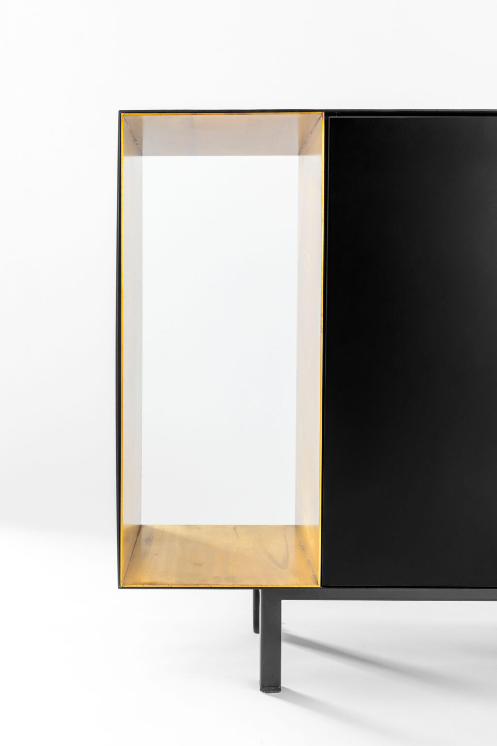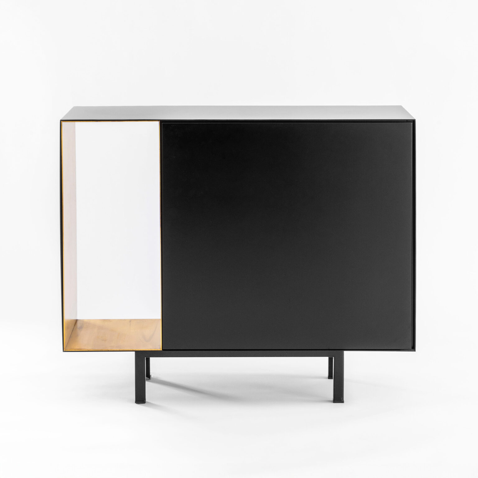 Credenza composta da cornice perimetrale in lamiera di ferro verniciata, contenitore in mdf laccato opaco e rivestimenti in ottone. Gli interni sono in mdf laccato opaco e organizzati con mensole riposizionabili.